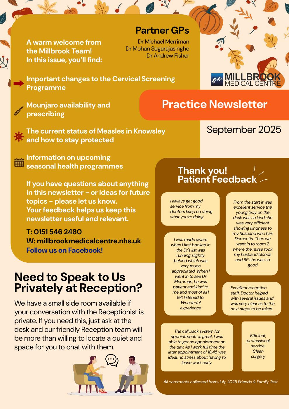 Practice Newsletter Practice NewsletterRead the latest news for our practice and local services September 2025 June 2025 October 2024 July 2024 April 2024 Download as a .PDF file Printed copies are also available at Reception Download as a .PDF file Printed copies are also available at Reception Download as a .PDF file Printed copies are also available at Reception Download as a .PDF file Download as a Microsoft Word file Printed copies are also available at Reception Download as a .PDF file Download as a Microsoft Word file Printed copies are also available at Reception